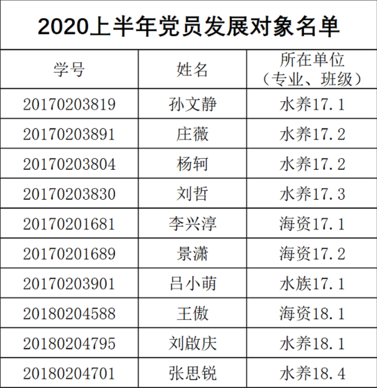 根据党委组织部《关于举办党校第二十六期入党积极分子和2020年上半年党员发展对象培训班的通知》要求,在听取培养联系人、党员和群众意见的基础上,经支部委员会研究,学院总支委员会讨论决定,将孙文静等10名同志列为发展对象。根据发展党员工作有关要求,现将人员情况公示如下: