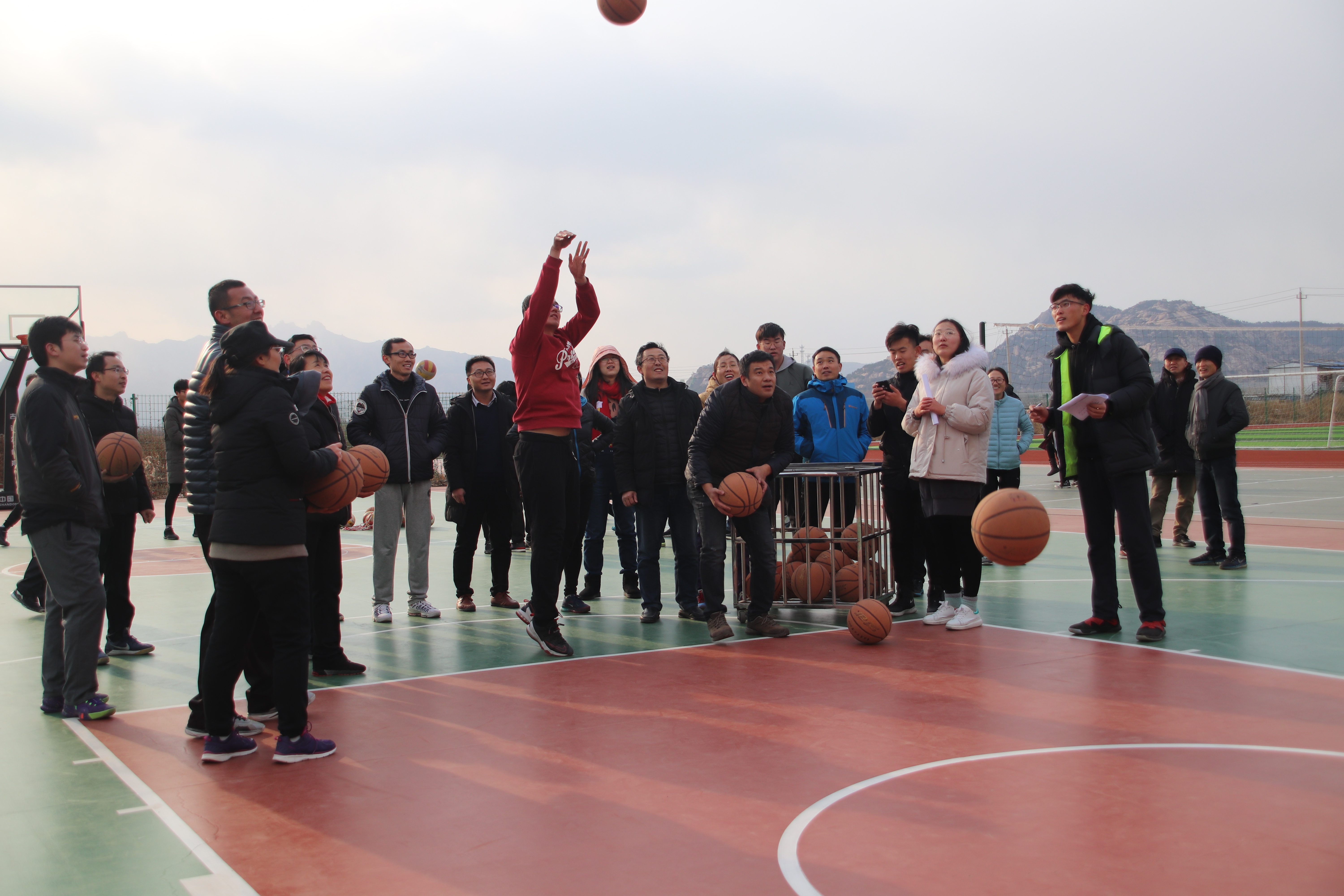 首先进行的是单人项目“我是神投手”投篮比赛。篮球从教职工们的手中划出一道道完整的弧线,落入筐中。伴随着篮球落地的声音,积分也收入囊中。