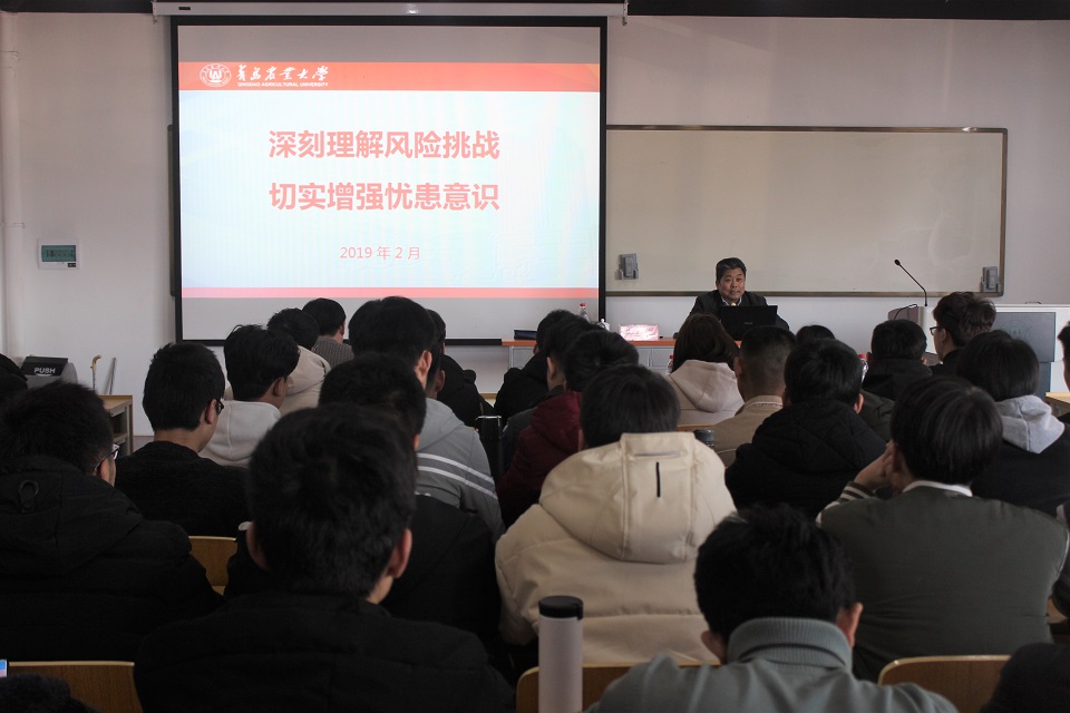 朱连勤以“深刻理解风险挑战,切实增加忧患意识”为题,从何为“重大风险”、重大风险有何内容以及如何防范化解三方面入手,结合“颜色革命”、历史虚无主义、“普世价值论”、中美贸易战、萨德反导系统等国际问题系统阐述了政治风险、意识形态风险、经济风险、科技风险、外部环境风险、社会风险、党的建设风险七大风险存在的缘由、性质及具体表现形式,并引用“木桶原理”和历史经典著作《生于忧患,死于安乐》,告诉同学们:中国进入新时代,战略机遇前所未有,重大挑战前所未有。面对所取得的前所未有的巨大成绩,不能有高忱无忧、盲目乐观的思想,而要‘安而不忘危,存而不忘亡,治而不忘乱’”。