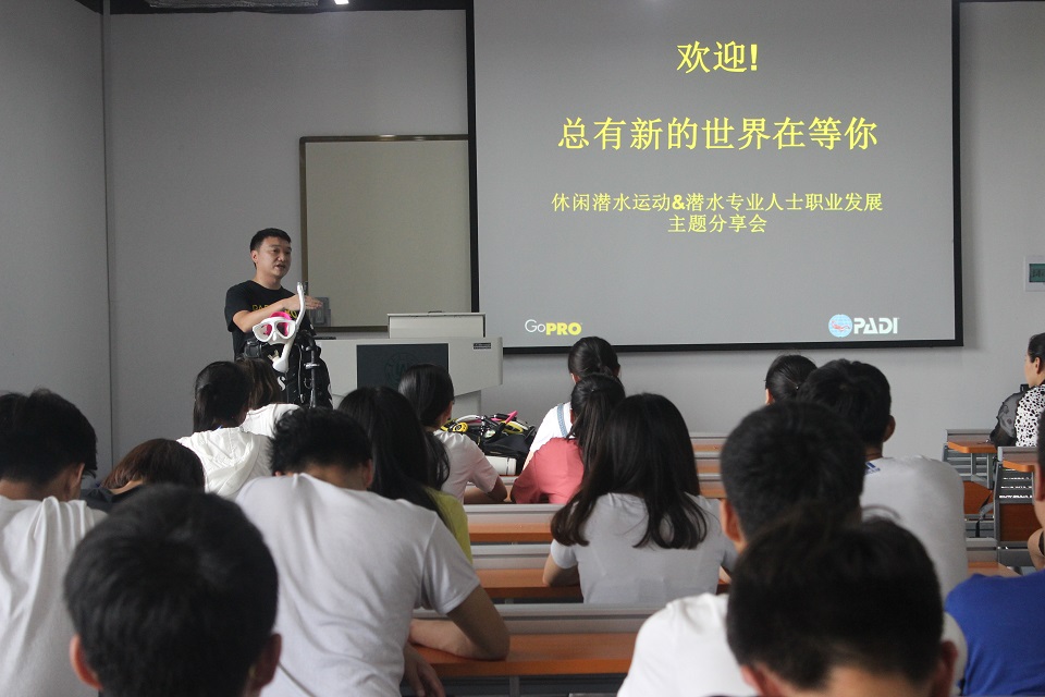 杨赛介绍了以“成为全球最好的潜水教育组织”为口号、以“做全世界学习潜水的途径”为目标的潜水教练专业协会“ProfessionalAssociation of DivingInstructor(简称PADI)”, 详细阐述了学习潜水的原因与优势,并与现场同学们分享了自己在南太平洋“与鲨共舞”的潜水经历。随后,杨赛就水族科学与技术可选修课程《开放水域潜水员》进行详细介绍,讲述了潜水教练的四大考量标准,推出“零到英雄”潜水助学计划——“Zero to Hero”。