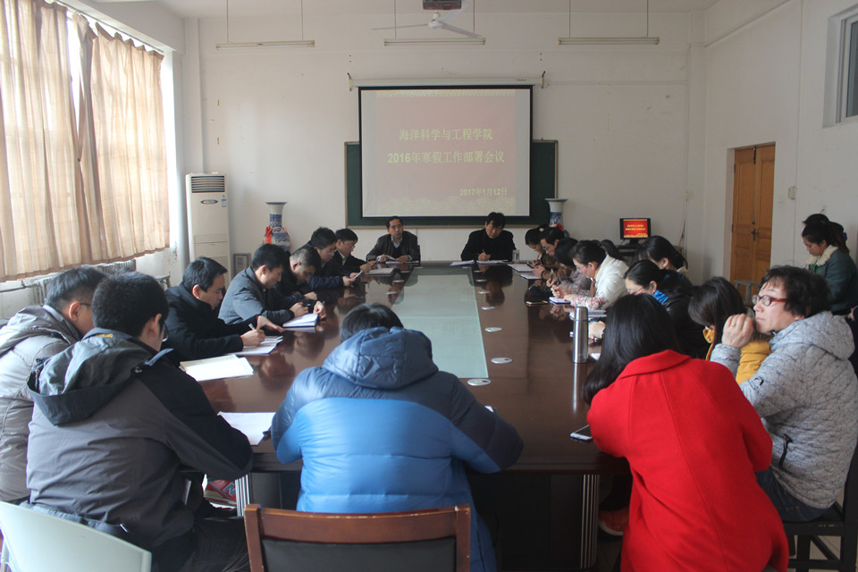 1月12日,海洋学院于学院会议室召开2017年寒假工作部署会议,海洋学院党总支书记潘庆杰、院长周顺及学院全体教职工参加会议。