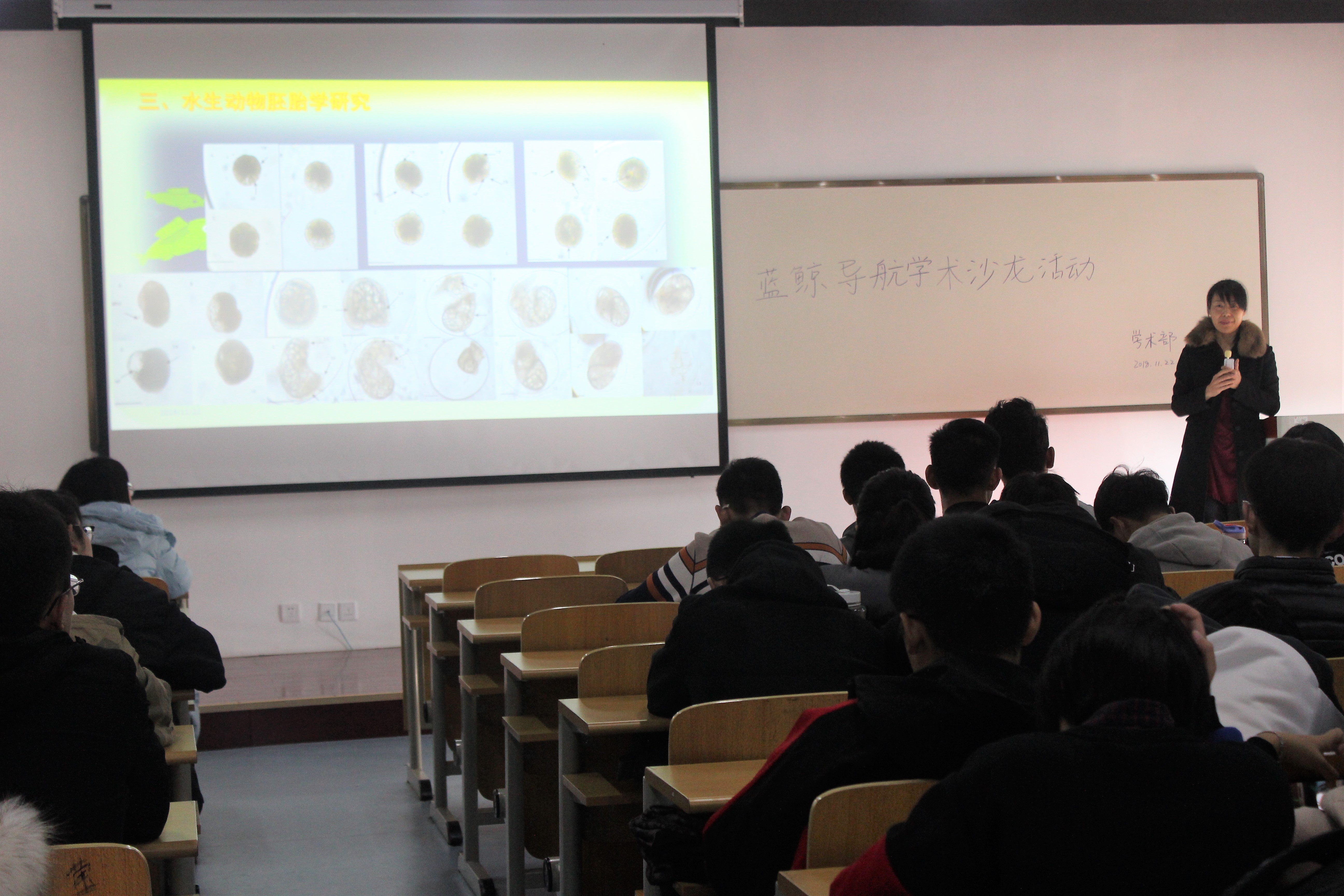 郭恩棉通过PPT为同学们简要阐述了组织胚胎学、分子生物学的研究内容、发展方向,介绍了海洋生物种群遗传、水生动物繁殖以及胚胎发育方面的研究进程,并从种群遗传学研究讲起,以折线图的形式展示了各群体在冰川期影响后平均配对差异。同时,她用水生动物胚胎发育对比图形象的讲述了不同时期水生动物的发育情况。郭恩棉结合自身求学经历,建议同学们对自己的大学生活有一个准确的奋斗目标,并向同学们说明了尽早选择蓝鲸导航工程导师的重要性。