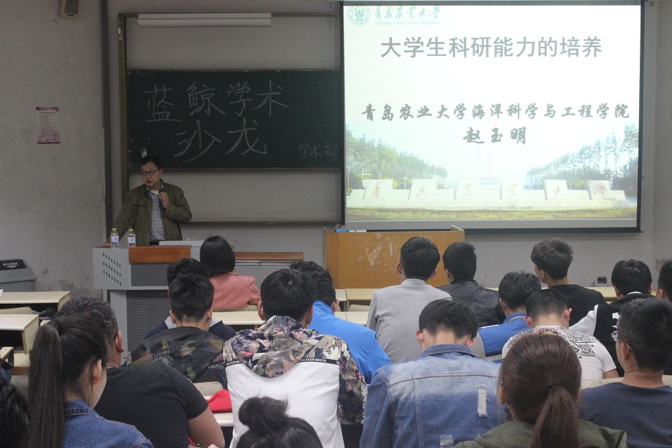 此外,来自水生生物营养与饲料教研室的赵玉明老师主要研究方向是水产无脊椎动物增养殖。他表示对于海洋学子来说,从事研究工作是日后一大重要出路,因此,科研能力的培养对学生而言是十分必要且有用的。他借以自身丰厚经验向同学们讲解了有关大学生科研能力的培养目的及要求,他从主动探索意识、科研的态度、论文写作的能力三个方面进行详细的讲解。他建议同学们尽力全面掌握这三种能力,为日后个人科研工作的顺利进行奠定良好的基础。