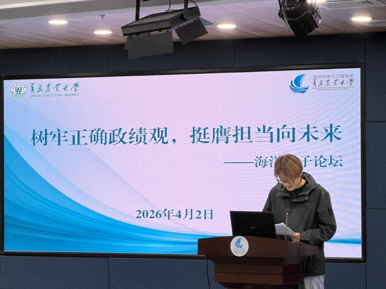 论坛以“树牢正确政绩观,挺膺担当向未来”为主题,聚焦学生骨干的角色定位、服务意识与成长方向,引导青年学子树立求真务实、甘于奉献的价值导向。论坛期间,大家集体观看了《为民出政绩 实干出政绩》专题视频。水养2401班刘东俊结合自身学生工作与学习实践经历发出倡议:一是要正确理解“政绩”,把服务人民作为青春的价值坐标;二是要坚守“实干”精神,把求真务实作为成才的必经之路;三是要勇担“海洋”使命,把向海图强作为奋斗的时代主题。他呼吁同学们雅以此次学习为契机,树牢“为民出政绩、实干出政绩”的正确观念,不驰于空想,不骛于虚声,以扎实学识、过硬本领、务实作风,把青春热血挥洒在蔚蓝海洋,把奋斗文章书写在祖国海疆,在建设海洋强国、实现民族复兴的壮阔征程中,写下属于海洋青年的精彩篇章!