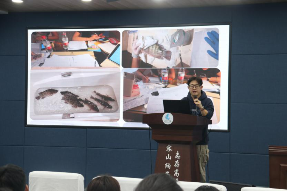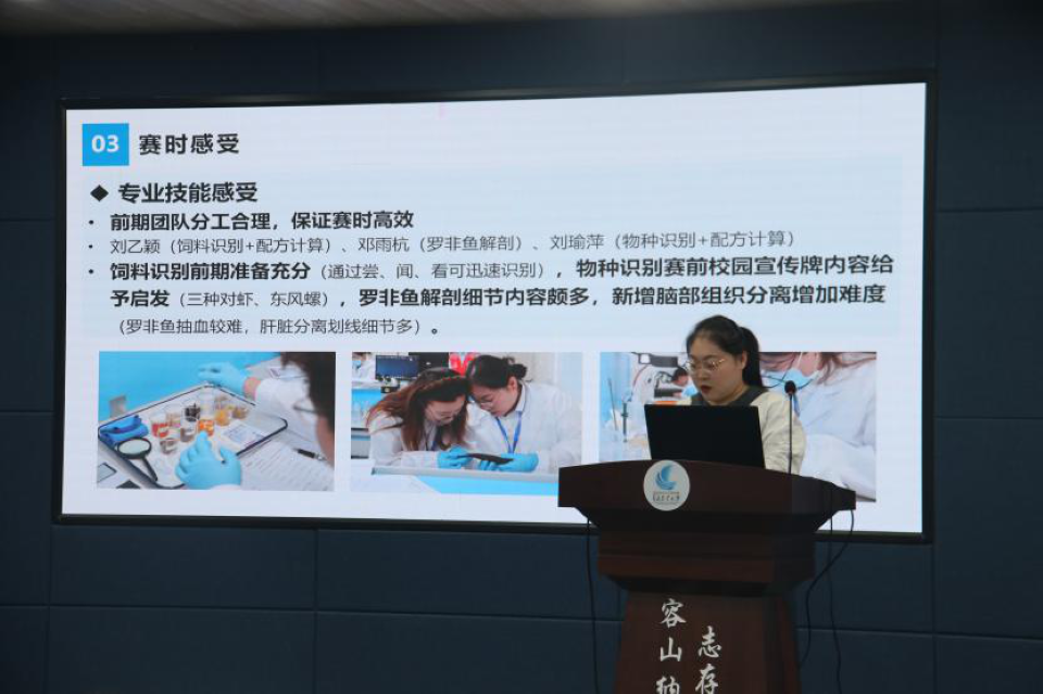会议进入经验分享环节。此次创新创业分享会邀请了第四届“渔菁英挑战赛”国家级赛事中荣获团队一等奖的“青衿纳远队”队员代表刘瑜萍与荣获团队三等奖的“大渔海棠队”队员代表张晁玮作为此次论坛的主讲人。他们结合参赛历程,系统分享了从赛前理论知识与操作技能的学习准备到现场答辩的全过程经验,并就在团队协作、时间管理、应变处理等关键环节分享了切实可行的做法与深刻体会。