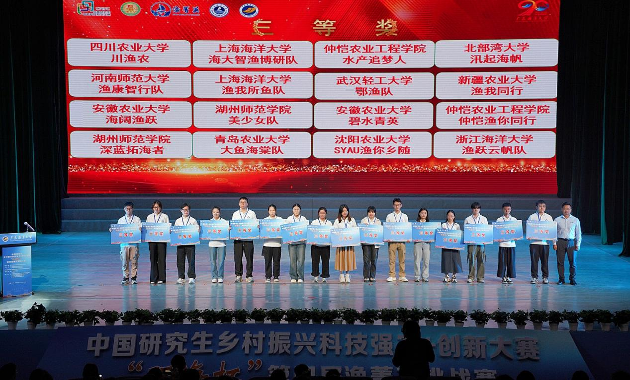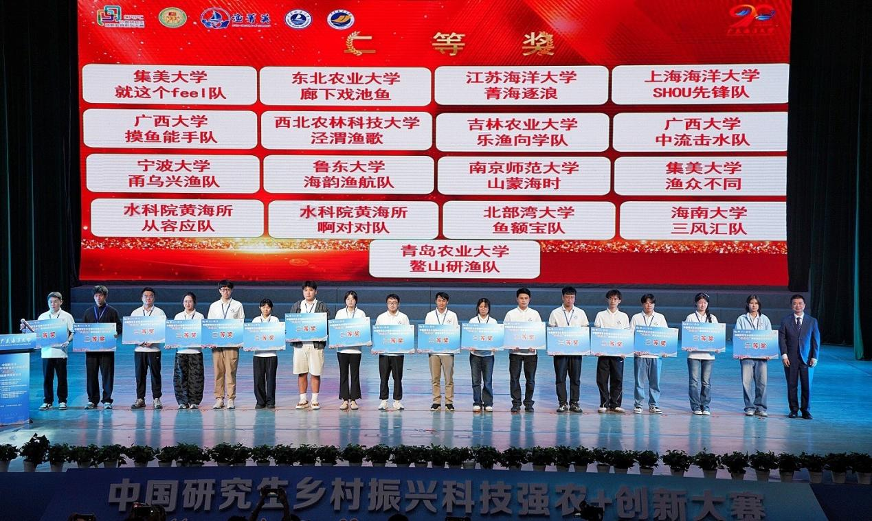 10月24-26日,由中国学位与研究生教育学会、中国科协青少年科技中心主办,广东海洋大学和大连海洋大学承办的中国研究生乡村振兴科技强农+创新大赛第四届渔菁英挑战赛决赛在广东海洋大学举行。青岛农业大学海洋科学与工程学院入围决赛的3支团队在激烈的竞争中脱颖而出,斩获团体一等奖1项、二等奖1项和三等奖1项,李琳、李庆飞老师荣获“优秀指导教师”称号。