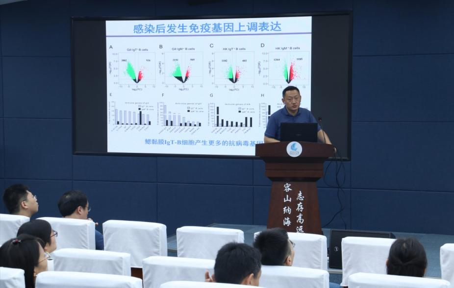 会议伊始,海洋科学与工程学院副院长李超为同学们介绍徐镇教授的科研方向和科研成果。随后,徐镇教授向同学们讲述了相关科研内容,以硬骨鱼类虹鳟为研究对象,揭示了鱼类口咽腔黏膜内存在有弥散型MALT,研究还发现免疫球蛋白IgT在口腔黏膜抗感染过程中发挥着重要的作用,并从学术角度为大家详细分析了全球热点问题的影响及未来变化。报告结束后,徐镇耐心回答了同学们的疑问,并与同学们深入交流了鱼类黏膜免疫与B淋巴细胞研究方向的科研问题。