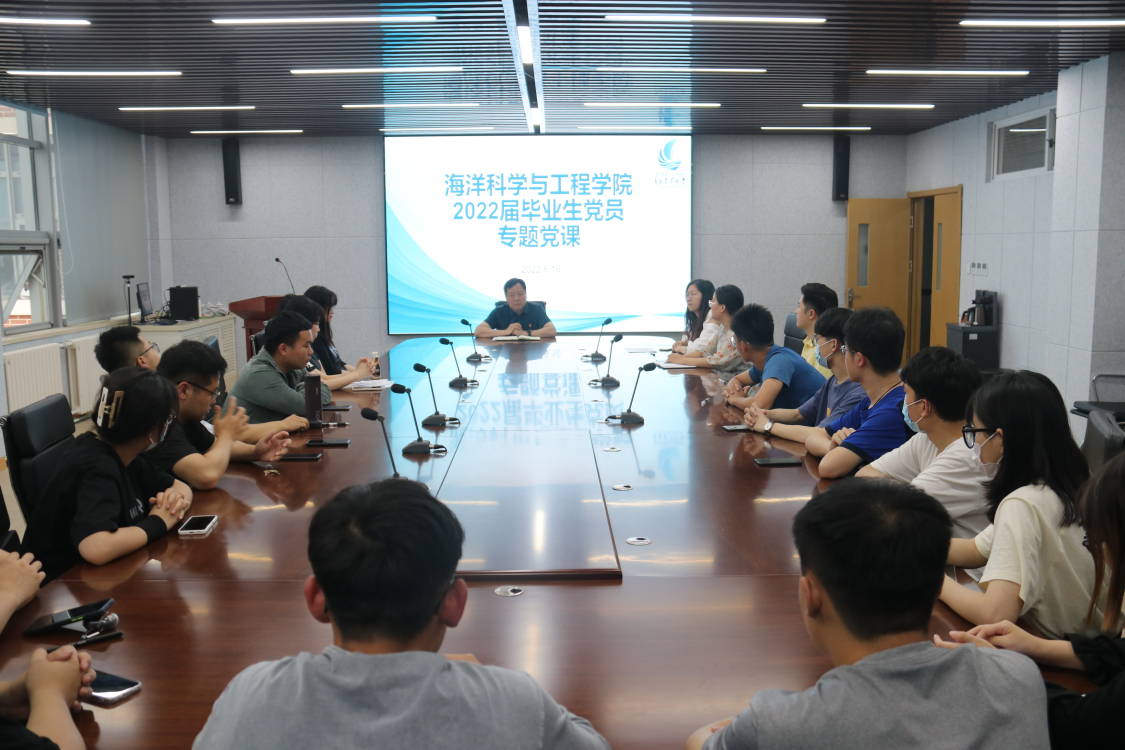 6月16日,海洋科学与工程学院党总支书记张国利为毕业生党员讲党课,2022届毕业生全体党员参加。