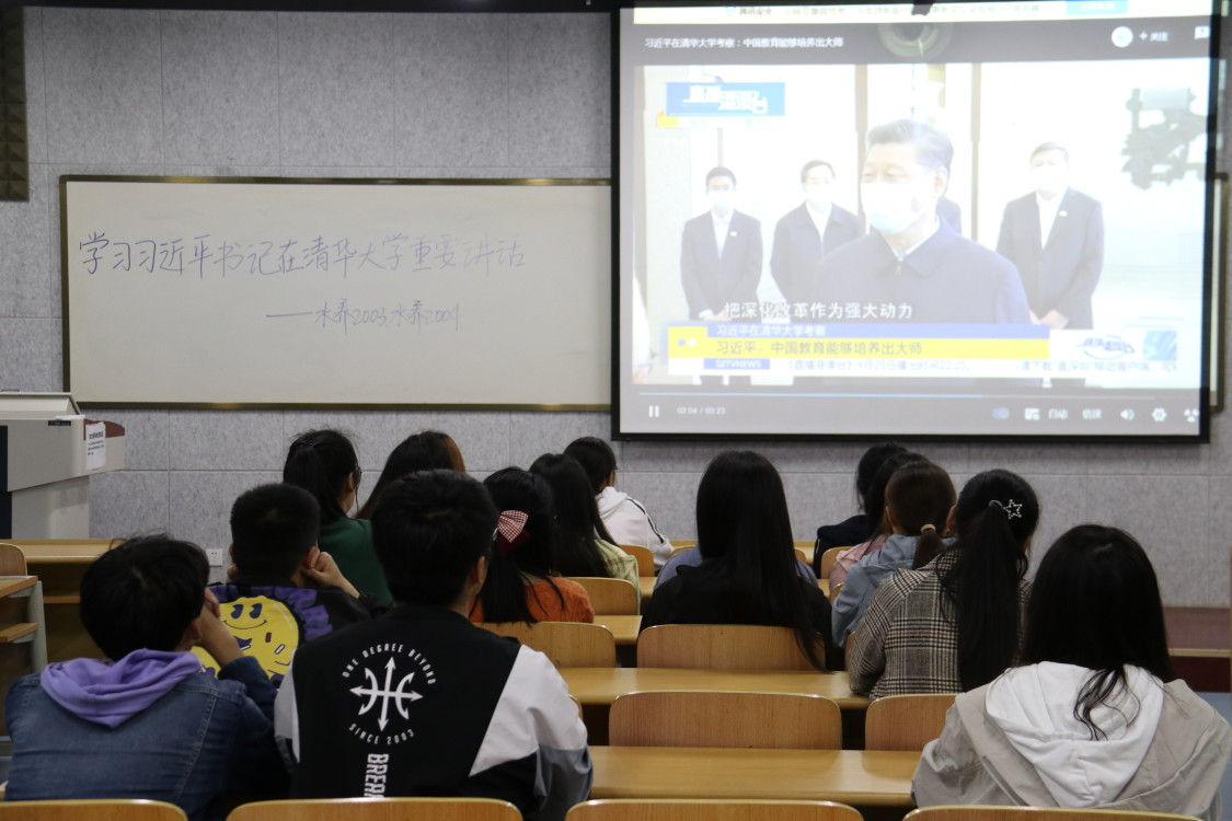 各班团支书组织同学们观看“习近平总书记考察清华大学重要讲话”的相关视频并朗读相关文章。在清华大学一百一十周年校庆来临之际,习近平总书记前往清华大学进行考察工作并发表重要讲话。习总书记强调,我国高等教育要坚持立足中华民族伟大复兴战略全局,为国家富强、民族复兴、人民幸福培养高素质人才,广大青年要肩负历史使命,立大志、明大德。清华大学展示了近年来的重点科研教育成果,并表示将加强学科针对性建设,打造中国特色学术体系,引起热烈反响。