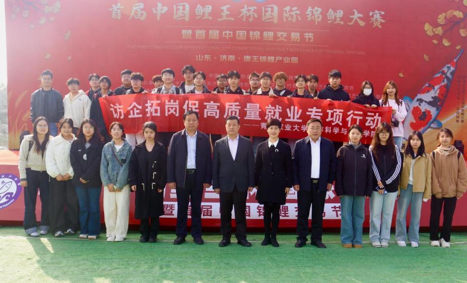 11月1日,青岛农业大学副校长王永健带队开展“访企拓岗”促就业专项行动,走访慰问优秀校友,并出席“首届中国鲤王杯国际锦鲤大赛暨首届中国锦鲤交易节”大赛。海洋科学与工程学院2007级水产养殖学专业优秀校友、山东水产学会锦鲤分会会长、山东唐王鲤农业发展有限公司董事长蒋世波会见王永健一行。