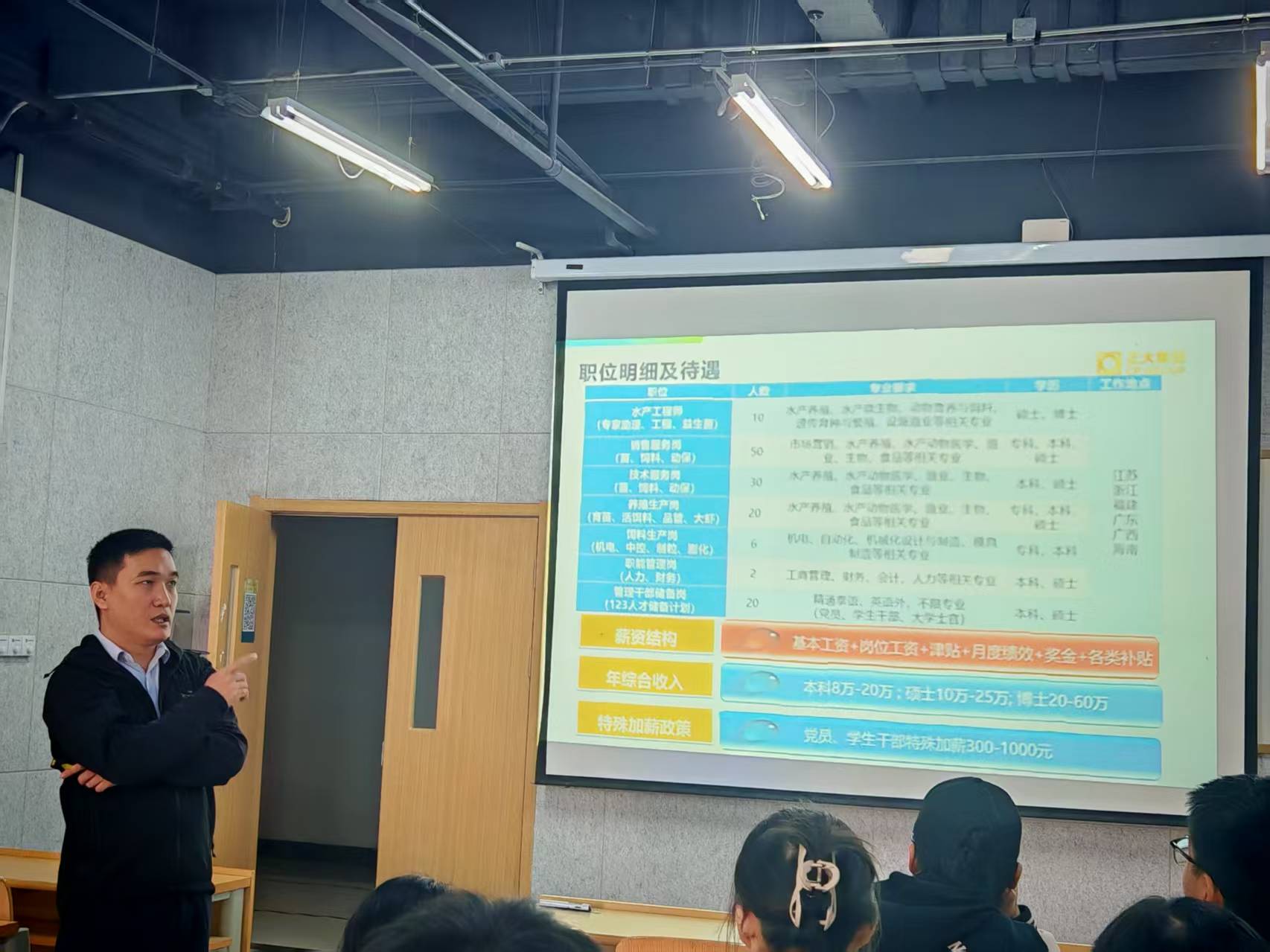 宣讲现场,广东分区负责人全面解读了企业发展理念、人才培养体系及核心招聘需求。本次招聘涵盖水产工程师、销售服务、技术服务、养殖生产等多个岗位类别,工作地点遍及广东、山东、海南等国内省份及泰国等海外地区。薪酬福利方面,企业将提供具有市场竞争力的薪资待遇与完善的五险一金保障,同时为党员及学生干部设置300-1000元专项津贴。互动交流环节,广东分区负责人针对同学们关切的岗位技能要求、职业发展路径等问题逐一答疑解惑,并向广大学子发出积极投递简历的邀请。招聘宣讲会在热烈融洽的氛围中圆满落幕,在场学生均表示收获满满,会积极筹备并参与后续的招聘环节。