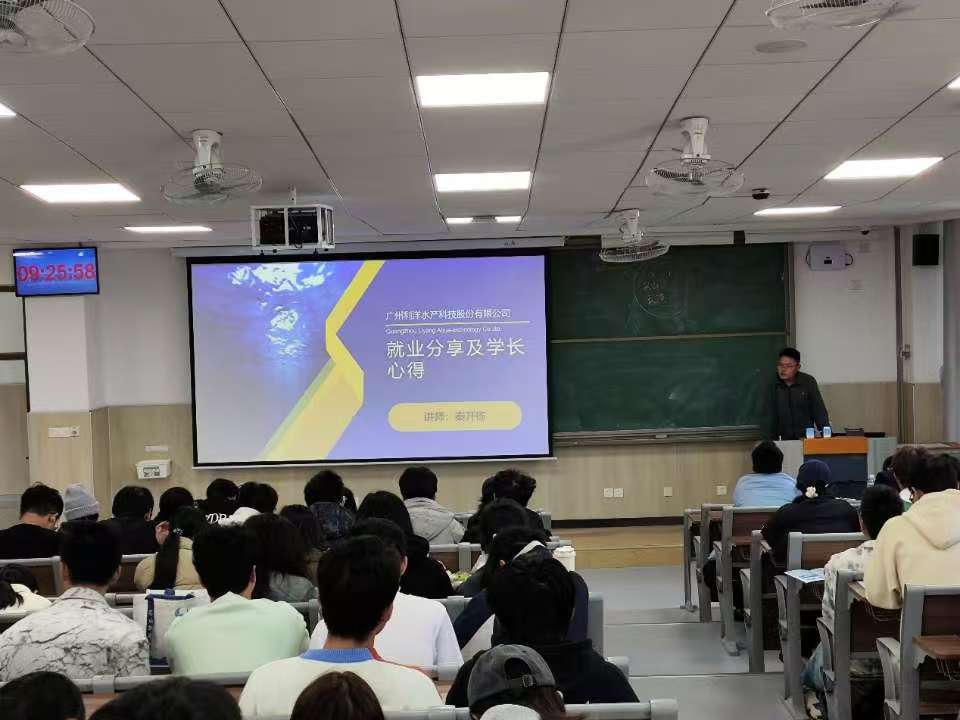 为了助力2024级新生深入了解所学专业内涵和专业发展前景,培养同学们的专业规划意识与理性抉择能力,坚定专业信心,树立个人目标,10月23日,海洋科学与工程学院于平度校区博学楼A202、C107开展大一新生专业教育讲座,会议邀请广州利洋水产科技股份有限公司企业讲师李磊、秦开栋进行主讲,水产养殖学专业和水生动物医学专业全体2024级新生参会。