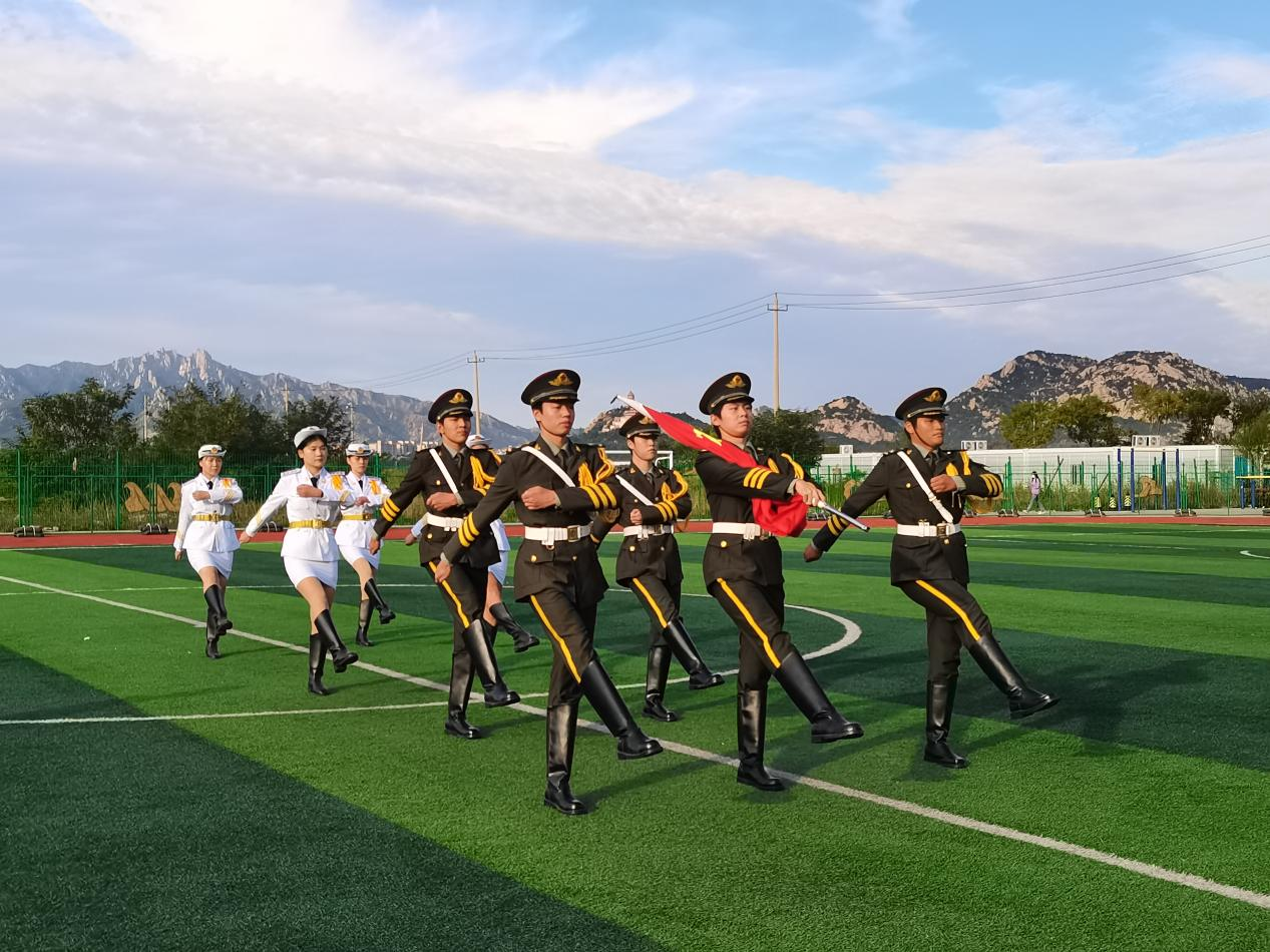 正步铿锵堂堂气,寒光闪耀凛凛威。国旗护卫队踏着铿锵有力的步伐进场,年轻人的朝气与担当在此刻发生碰撞。擎旗手嘹亮的口令,坚毅的眼神,昭示着新时代海洋学子昂扬向上的精气神。蔚蓝晴空下,伴着雄壮的国歌,五星红旗迎风飘扬,全场庄严肃立,整齐队列向国旗行注目礼。
