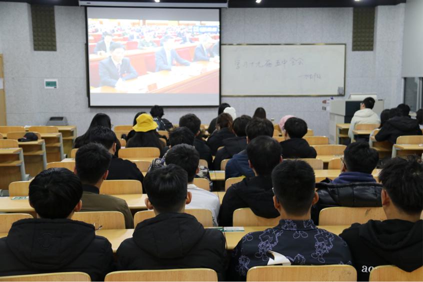 各班团支书组织同学们观看视频《学习十九届五中全会》,视频讲述了中国共产党第十九届中央委员会第五次全体会议具体内容。“十四五”时期是我国全面建成小康社会、实现第一个百年奋斗目标之后,向第二个百年奋斗目标进军的第一个五年。瞻望新征程,我国发展仍然处于重要战略机遇期。全会强调,迈向全面建设社会主义现代化国家新征程,一要坚持创新核心地位,发展现代产业体系;二要构建新发展格局,实现高质量发展;三要坚定不移深化改革扩大开放;四要弘扬核心价值,坚定文化自信;五要促进人与自然和谐共生;六要促进人的全面发展和社会全面进步,筑牢安全屏障,建设平安中国;七要坚持党的全面领导,坚决落实,开拓新发展阶段的美好前程。