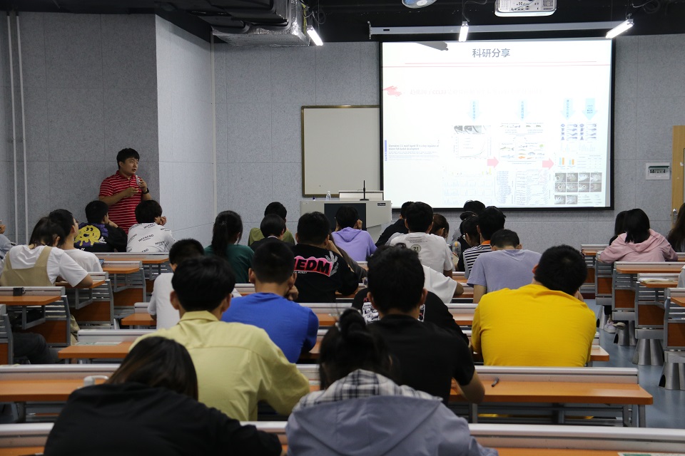 活动伊始,傅强老师生动幽默的语言为同学们详细讲述了自己在学生时代的奋斗历程,无论是清晨在图书馆开门前努力背书的他,还是出国后仍旧不断进取、专心科研的他,都使同学们深刻体会到了努力的重要意义。随后,傅强老师为同学们讲解目前的研究方向与成果。傅强老师指出,鱼类免疫与病害防控研究中,利用生物信息学、多组学、分子生物学、免疫学等方法鉴定鱼类免疫过程关键调控因子并探究调控机制。并建议同学们对自己的大学生活有一个准确的定位,鼓励同学们夯实专业基础,找到自己的兴趣点,早日确定未来目标,选择适合自己的蓝鲸导师,并对感兴趣的内容进行研究、寻求突破。
